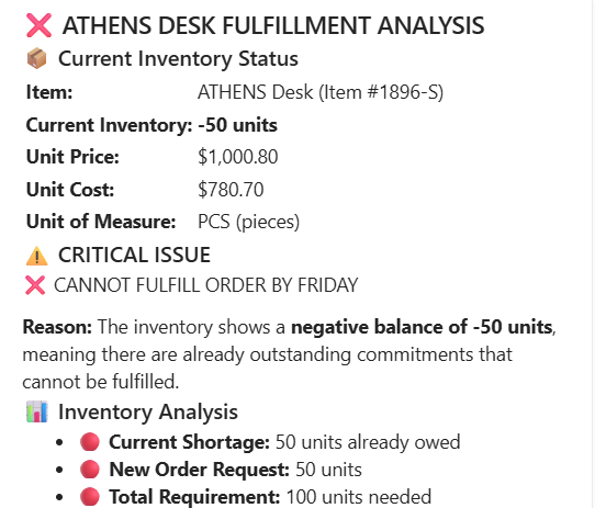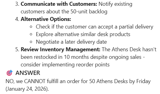 • The Copilot Interaction: The manager asks: “Can we fulfill an order for 50 ‘Athens Desks’ by Friday?”