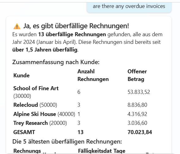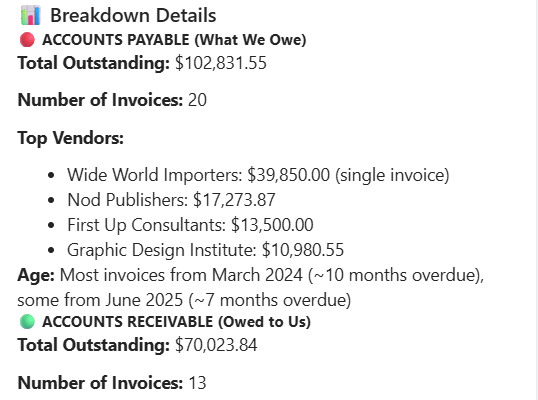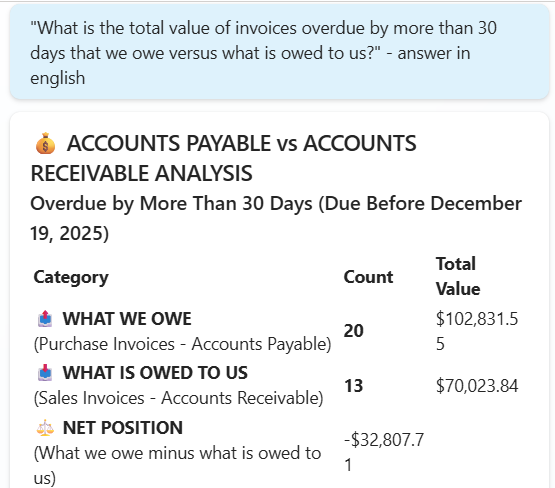 • Result: Copilot dynamically queries both APIs through the MCP server, aggregates the data based on the date filters, and presents a clear comparison of overdue payables vs. receivables.