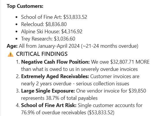 • The Copilot Interaction: The CFO asks: “What is the total value of invoices overdue by more than 30 days that we owe versus what is owed to us?”