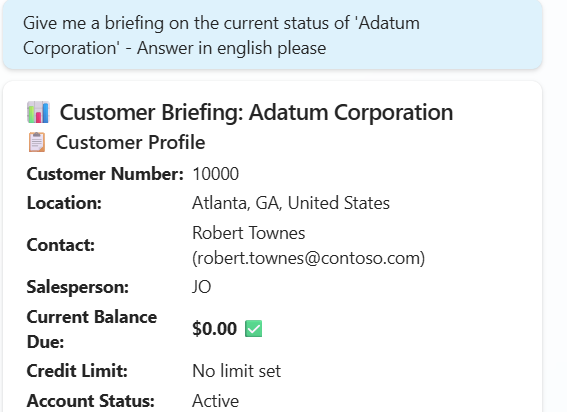 • The Copilot Interaction: The rep asks: “Give me a briefing on the current status of ‘Adatum Corporation’.”