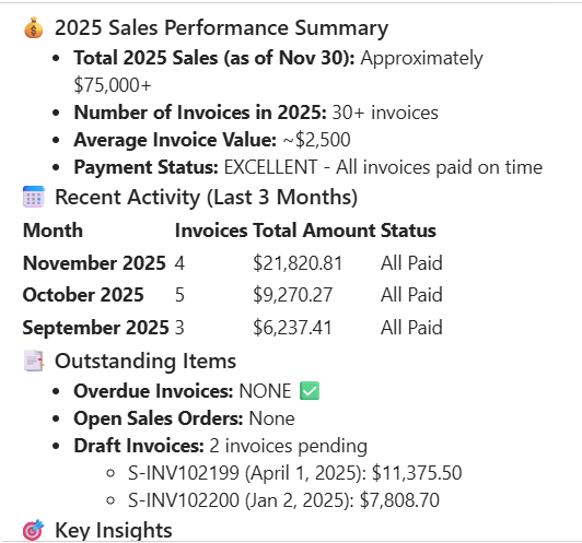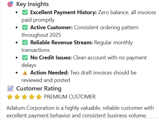 • Result: Copilot uses the MCP tools to retrieve the current balance, list the total value of open quotes, and flag any recent late shipments—all in a single summary response.